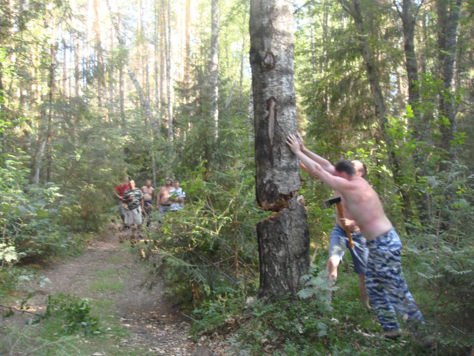 Около дороги стояла огромная засохшая береза. Кто-то пытался её неудачно срубить. Так она и стояла недосрубленная. Рыбаки решили устранить страшную угрозу