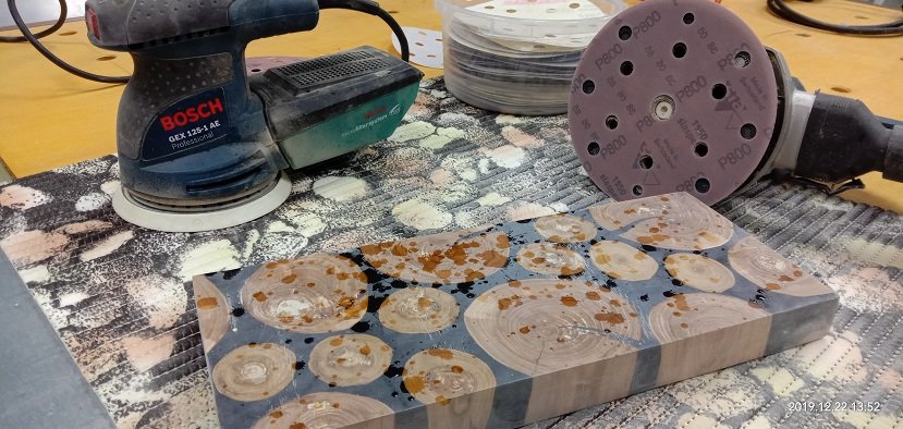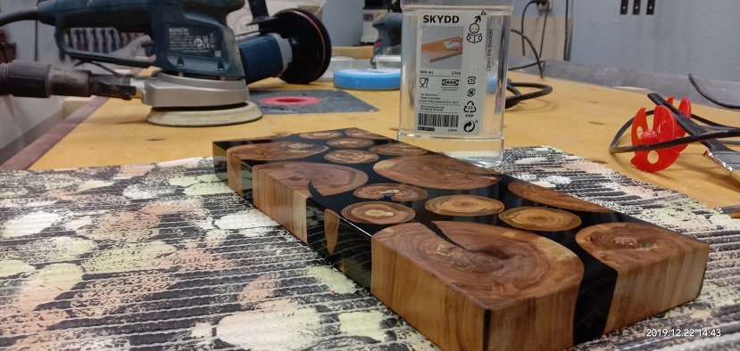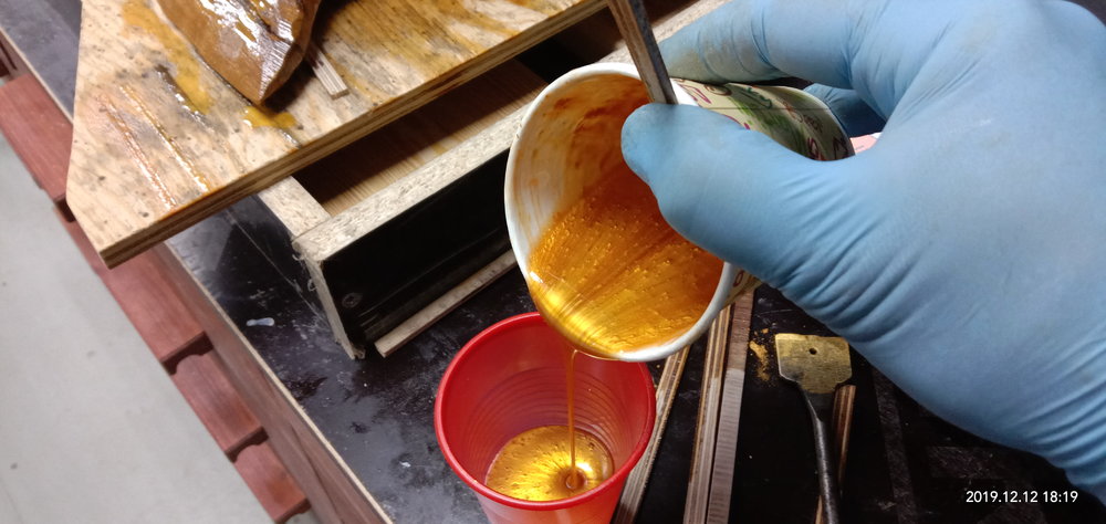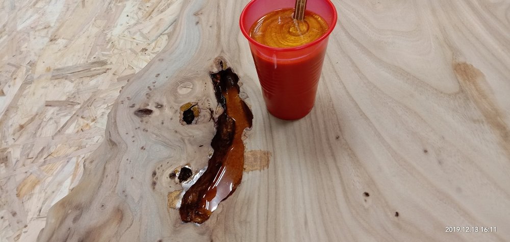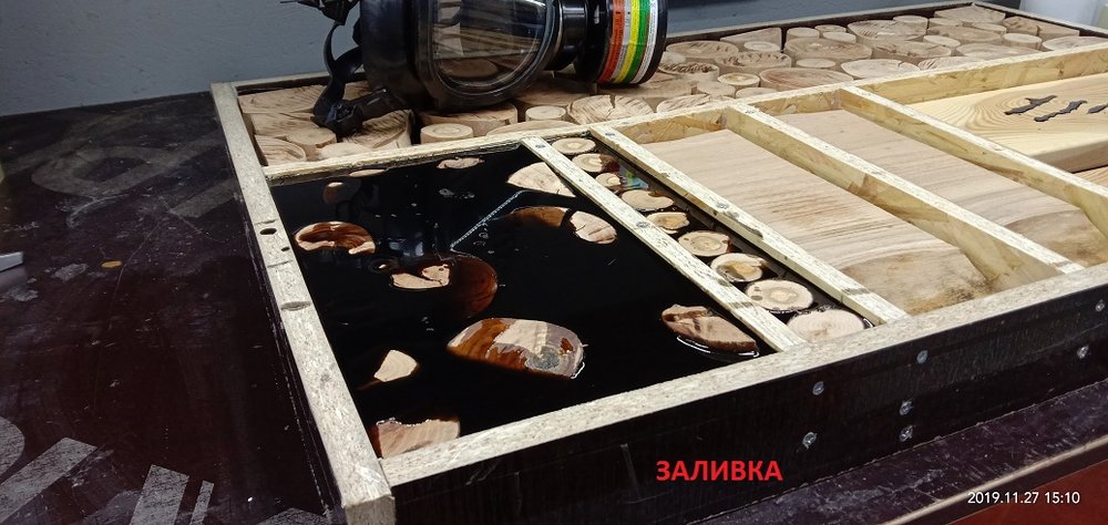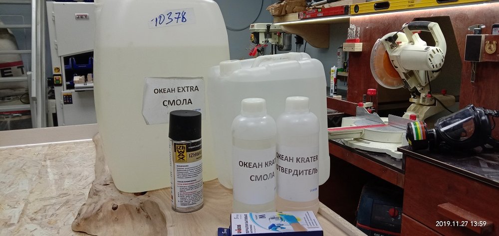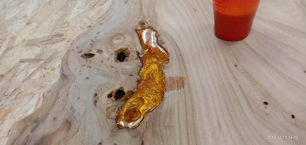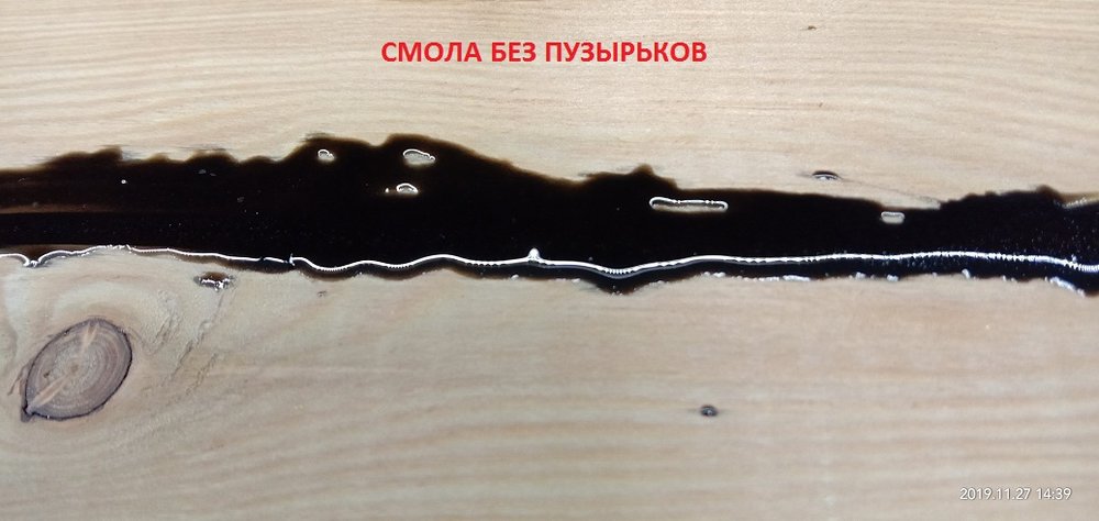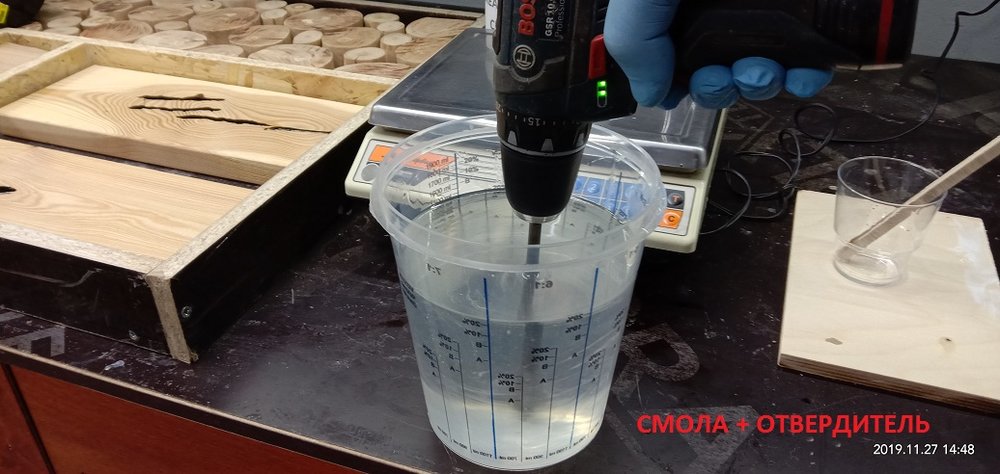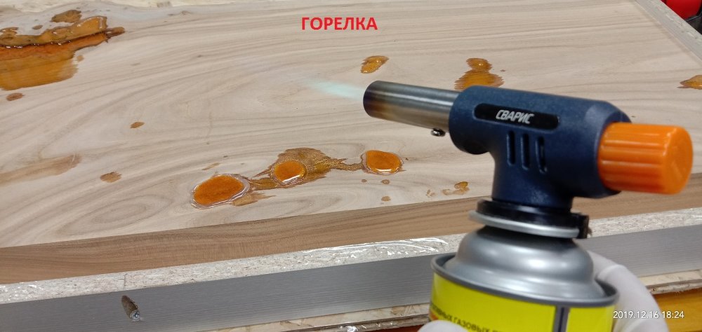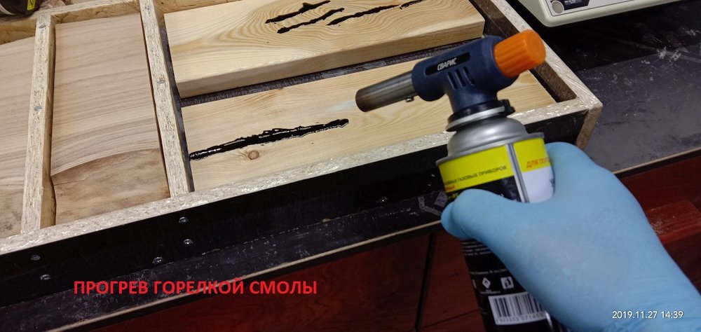 Сергей Алексеев Posted November 28, 2019 Posted November 28, 2019 Получил смолу, отвердитель (для массивной заливки и заделки трещинок), восковый разделитель (нужен чтобы смола не приклеивалась к опалубке). Смолу взял с Владимира. Наиболее гуманный ценник и оптимальные характеристики для заливки. Заклеил с обратной стороны заготовки фольгированный скотч (чтобы смола не протекла на стол) это у доски со сквозной трещиной. Развел смолу 100:70 и заполнил палочкой. Образовавшиеся микропузырьки прошёл газовой горелкой. Поверхностное напряжение смолы убирается и смола становится чистой. Очень удобно. Застывает смола для микро трещин в течении 10 часов. Дале по аналогии (отличие пропорций 100:41) залил смолу высотой 50 мм небольшой пробник со спилами яблони. Через 7 часов прогрел горелкой смолу, остатки пузырьков вышли. Потом на следующий день, через 18 часов после заливки вновь прошёл горелкой остатки пузырьков и.... ждём 5-7 суток (согласно инструкции). Удивила - впитываемость деревом смолы. Уровень снизился примерно на 8 мм!!! Очень пористая древесина яблони. 3