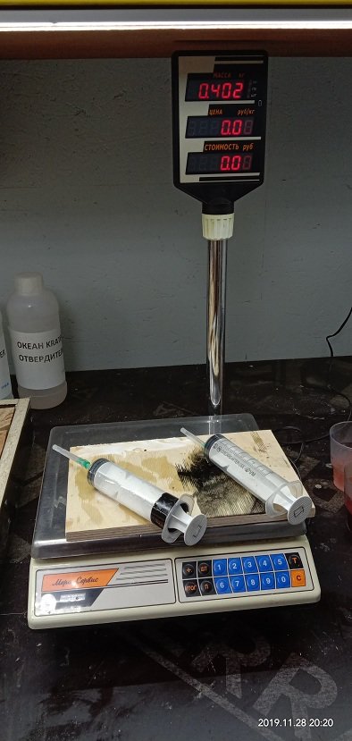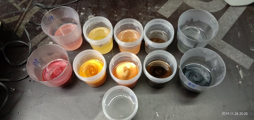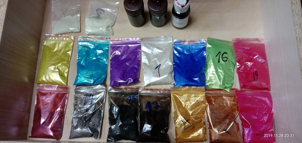 Сергей Алексеев Posted November 28, 2019 Posted November 28, 2019 Со смолой приобрел колеры обычные (пасты) и перламутровые колеры (порошок), а также люминофор (светящийся порошок). Решил попробовать отколеровать несколько образцов смолы. Взял шприцы, ими удобно осуществлять точную дозировку и на электронных весах (это нужная вещь для строгого соблюдения пропорций) отмерил нужное количество смолы и отвердителя. Порошка нужно мизер, чтобы получить эффект от полупрозрачного цветного "льда" до насыщенного перламутрового цвета. Стаканчики и палочки в помощь. 4