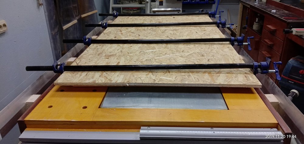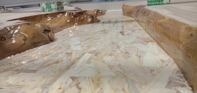 Сергей Алексеев Posted December 22, 2019 Posted December 22, 2019 По времени успел немного. Залил микротрещинки, впадинки на самой поверхности. Удалил скотч, отшлифовал (на грубую) верхнюю заливку трещин столешницы. Снял размеры (примерно) заливки. Объём рассчитал разбив изгиб на прямоугольники. Объём заливки примерно 40 литров смолы. Силиконом прошел вдоль контуров заливки и прогрунтовал торцы слэбов смолой. Струбцинами зажал заготовки. 2