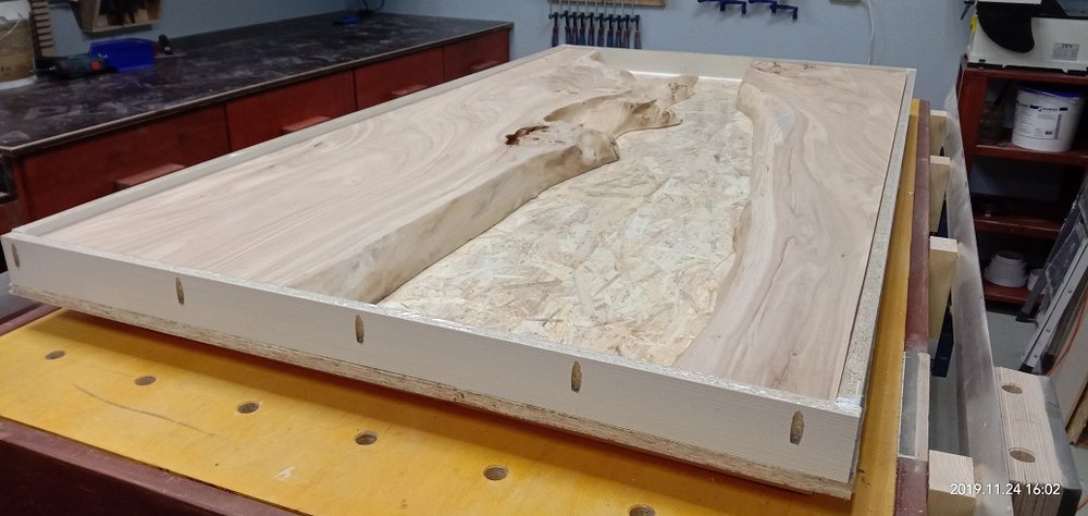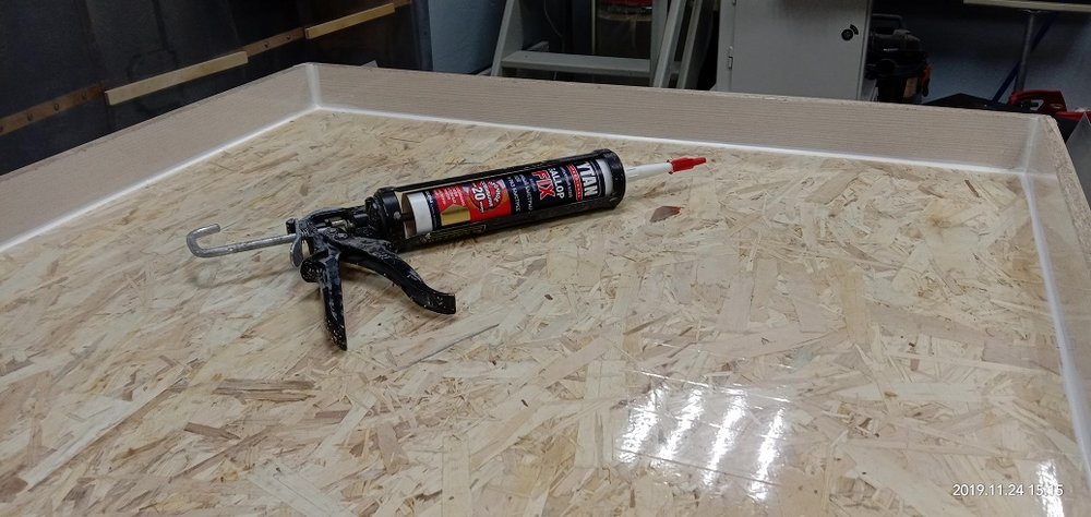 Сергей Алексеев Posted November 24, 2019 Posted November 24, 2019 Для заливки смолы естественно требуется короб. Взял шпунтованные ОСП панели, обычные обрезки ЛДСП. Распустил их на циркулярке. Склеил панели. Зашлифовал дно короба, обезжирил его и наклеил обычный пвх скотч (чтобы смола не приклеивалась к поверхности короба. Прошёл герметиком все стыки короба (иначе смола вытечет через любую микрощель). Ну и примерил как укладываются слэбы. 1