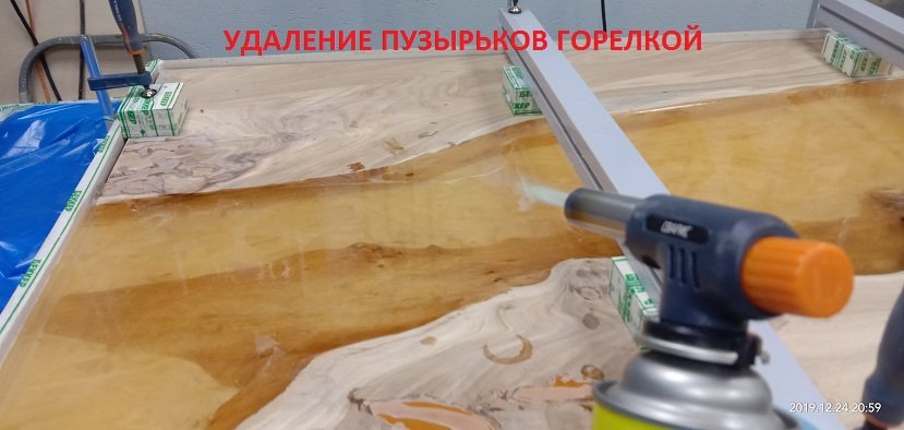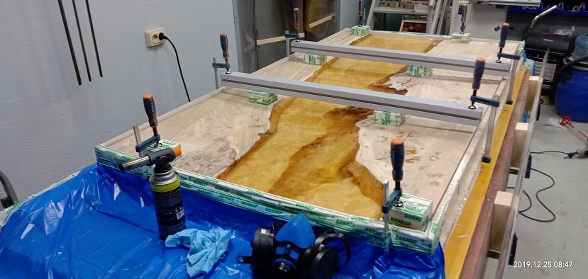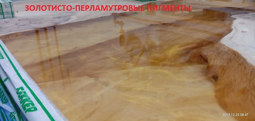 Сергей Алексеев Posted December 25, 2019 Posted December 25, 2019 Ну вот и свершилось. Вчера вечером развел смолу в пластиковом ведре. Нанес разделительный воск на основание заливки, просушил. Добавил золотистый порошковый колер в смолу, добавил отвердитель и порциями по 5 кг заливал смолу. По инструкции полагалось не выше 35 мм. Залил..... и понял, что с тоном колера ошибся, слишком бледный цвет. Назад дороги как говорится нет, размешал в остатки смолы более насыщенный цвет и перекрестившись залил до самого верха (это примерно 50-55 мм)... будь что будет. Утром приехал в мастерскую и слава богу "закипания" смолы не произошло. На фотографиях визуально выглядит хуже. В живую переливается перламутровым блеском с многочисленными вкраплениями микро золотинок. Мне понравилось. Жду 5-7 суток и приступлю к фрезерованию, шлифованию и окончательной полировке стола. 2