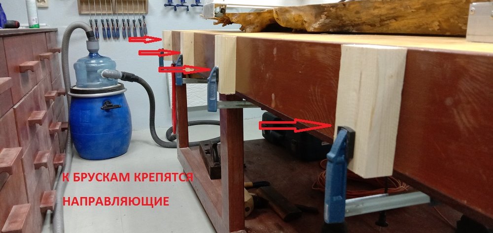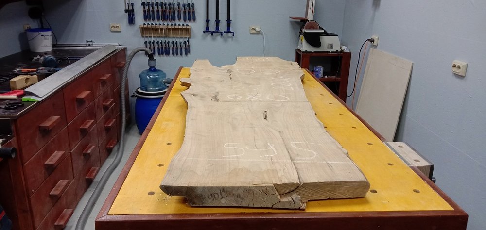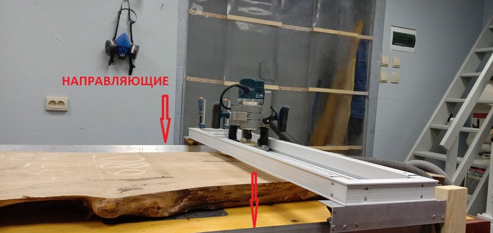 Сергей Алексеев Posted November 3, 2019 Posted November 3, 2019 Мною где то пол года назад был куплен слэб (по русски спил или распил) Карагача 75*800*2200 мм. Для столов из слэбов на основе заливной эпоксидной смолы это самое то. Высокая плотность, не впитывает воду, отличная видимость годичных колец. Планирую стол обеденный, размером (ориентировочно пока) 900*1900 себе в дачный дом. К столярному столу с обоих боков струбцинами зажал по 4 бруска. Уже к ним по уровню на саморезы прикрепил старенькие дешёвые правила из алюминия. По ним будет "ездить" (двигаться) каретка (из алюминиевого профиля) на роликах. По каретке перпендикулярно слэбу, будет двигаться ручной фрезер с фрезой и срезать слой древесины. Затем слэб переворачивается и осуществляется аналогичная операция. Таким образом достигается ровный слэб. Сейчас перепады составляют до 10-15 мм в одной плоскости. Если бы был промышленный рейсмус, шириной в метр, то эту операцию можно было сделать за 10 минут. В дальнейшем, после фрезеровки - шлифовка 40, 80, 120, 240 микрон зернистости. Заливка эпоксидной смолой, повышенной прозрачности. Снова шлифовка 40, 80, 120, 240, 320, 600, 1000 и 1500 микрон. Далее твёрдый воск для столешниц и полировка. 1 2