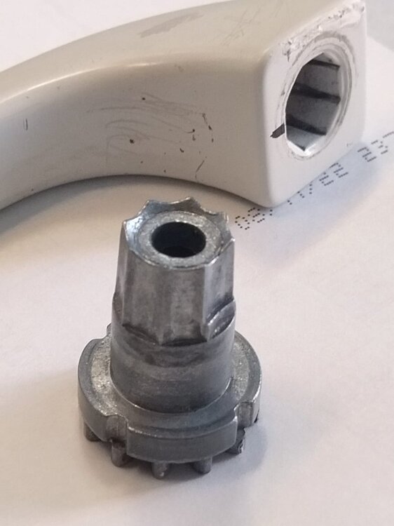 На шестерне крепление к рукоятке выглядит как восьмигранник слегка сходяший на конус. На одной грани нарезана лыска - при установке она должна "смотреть" в сторону изгиба ручки. Если на шестерне сломались один или два зуба ее еще можно заставит поработать(при условии что на ответной вилке зубы целые). На шестерне есть нерабочий сектор почти в пол оборота. На вилке потребуется сточить аналогичную лыску болгаркой/наждаком (слишком точно не требуется, можно сделать немного больше чем исходная). Лыску надо нарезать так чтоб после установки в ручку сломанные зубы смотрели в сторону изгиба. -